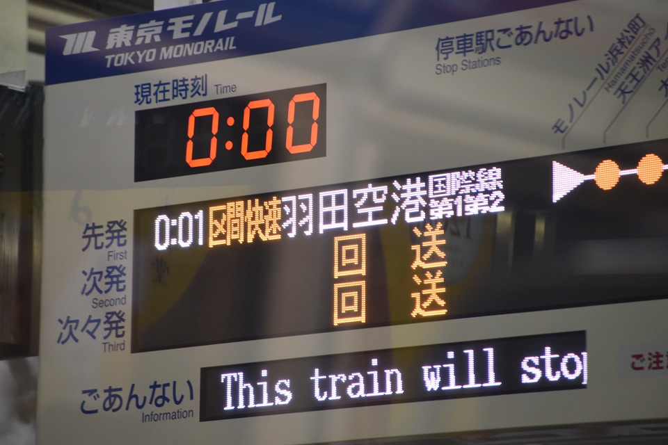 | 最初は新宿駅西口からまたバスで羽田空港に出ようと考えていたが、 長野からのバスがハズレだっただけに今回はもうバスに乗る気がせず、 山手線で浜松町へ出て、モノレールに乗り換えた。ちょうど最終便だった。 |
