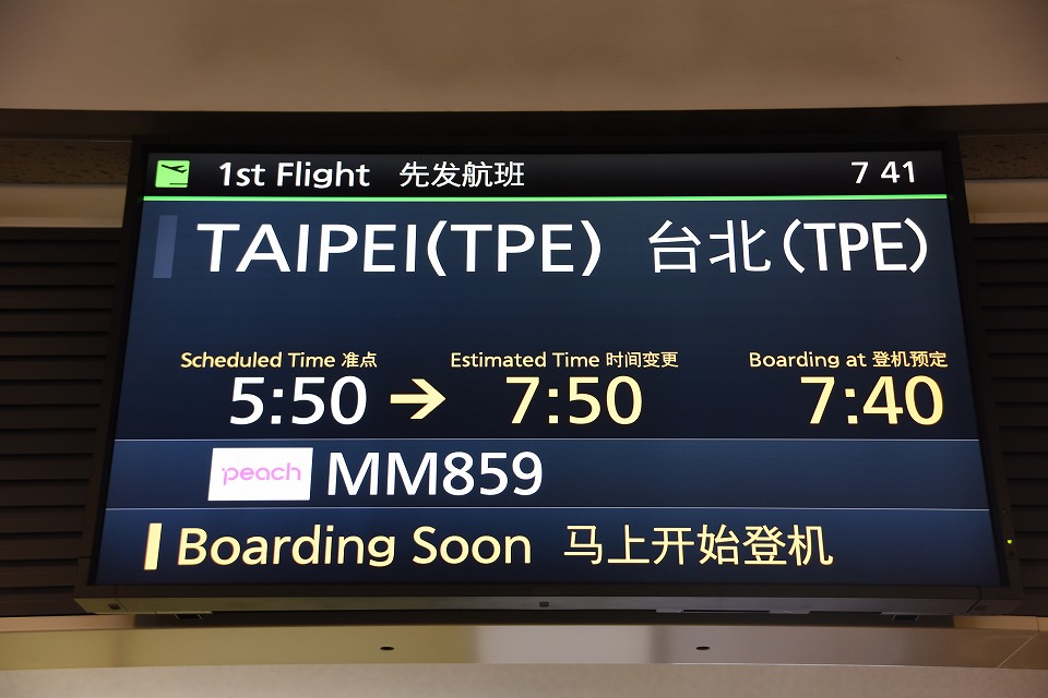| 国際線ターミナルでうとうとしながら時間を潰していたら、 早朝に、まず、出発が1時間ほど遅れるというアナウンスがあり、 搭乗口の変更も告げられた。 そしてさらにもう1時間遅れることになった…。 |