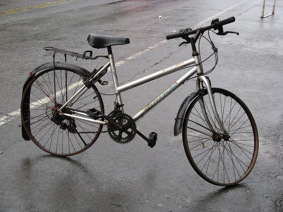 | 雨なのでサトウキビ列車の取材はあきらめて、 ちょっと離れた台湾国鉄の支線の駅にきっぷを買いに出かけることにした。 テツに縁がない方は「なんできっぷ?」と思うこととお察しします(笑)。あとでね。 虎尾公車站(虎尾のバス停・「バスタ虎尾」)へ向かう途中で、このいい加減なチャリを見つけた。 タイヤはないしチェーンも外れてるんだけど、ふつーに置いてあったので、 持ち主はきっと乗ってるんだよ(ほんまかいな。)。 |
