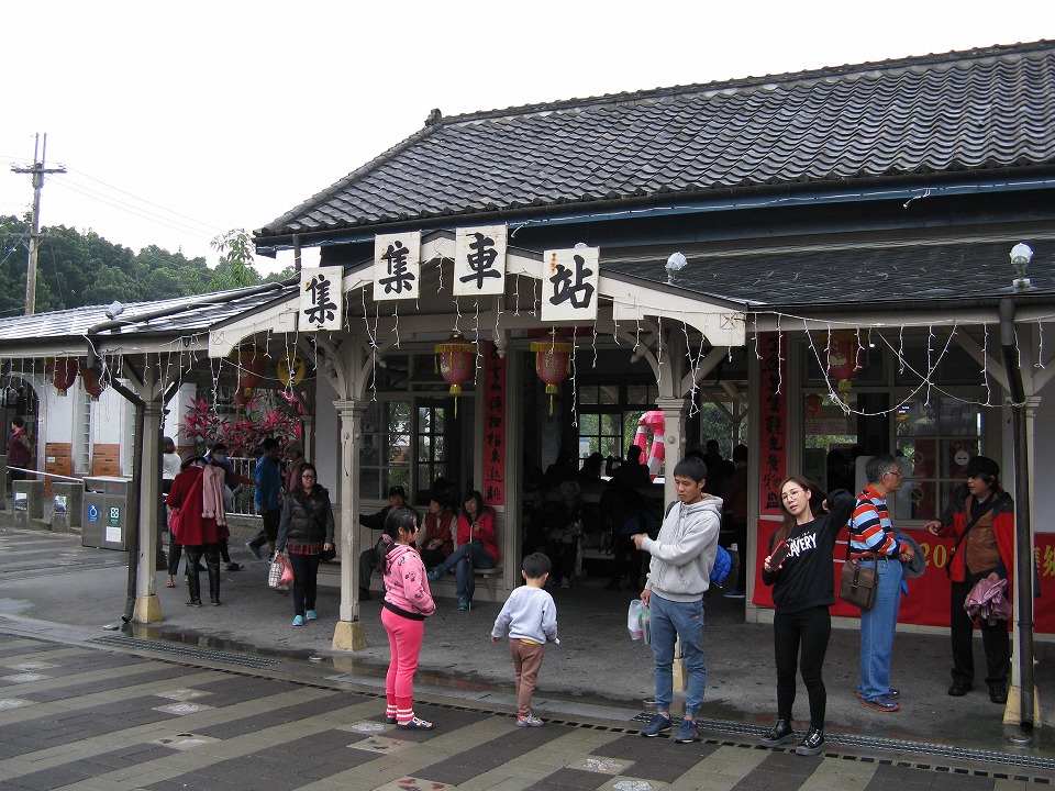 | 「車埕」の2つ隣の「集集」にも来た。 ここも大混雑! 駅前広場では、誰も聞いていないのに、じいちゃん2人がアンプを使って やかましく演奏してるし…(動画に撮ればおもしろかったかな。)。 |