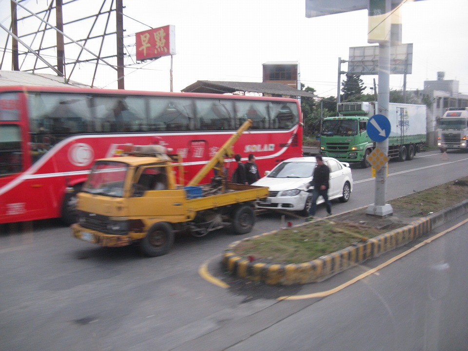 | 台湾国鉄の斗六駅から、滞在している虎尾へ向かうバスで移動中、事故処理していた。 これはどうか分からないけど、台湾では飲酒運転による交通事故がとても多いみたい。 TVでも割と頻繁に「被害者の訴え」みたいなのを放送してるよ。 |
