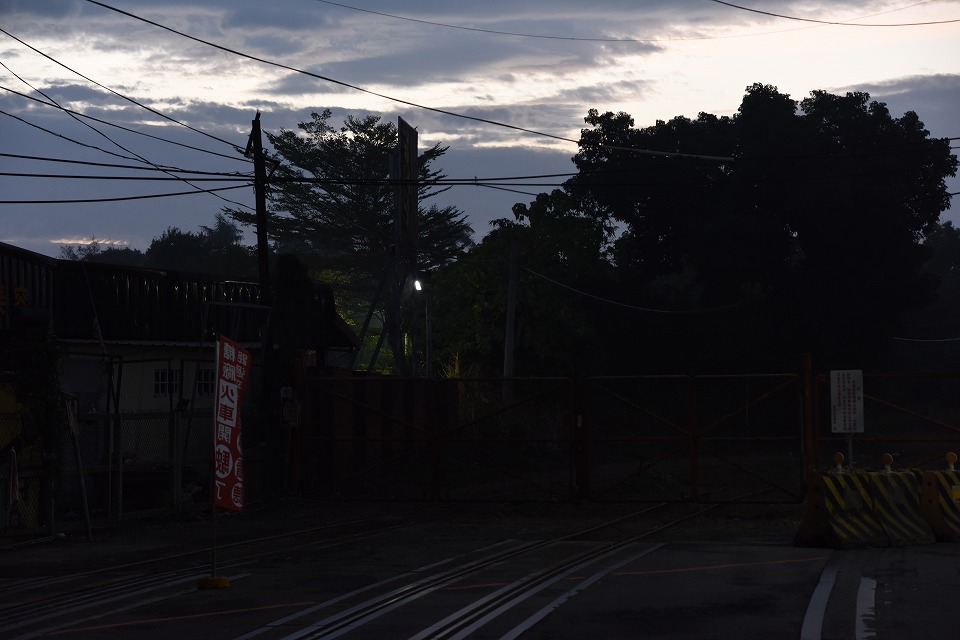 | 朝起きたら、月が見え隠れしてるし、何と星も見えた! やったね、とイソイソと準備をして、サトウキビ列車の前に製糖工場内を入れ替えする貨物列車を撮りに、 製糖工場の入口の踏切に来たが、まだ開門していなかった…。 |