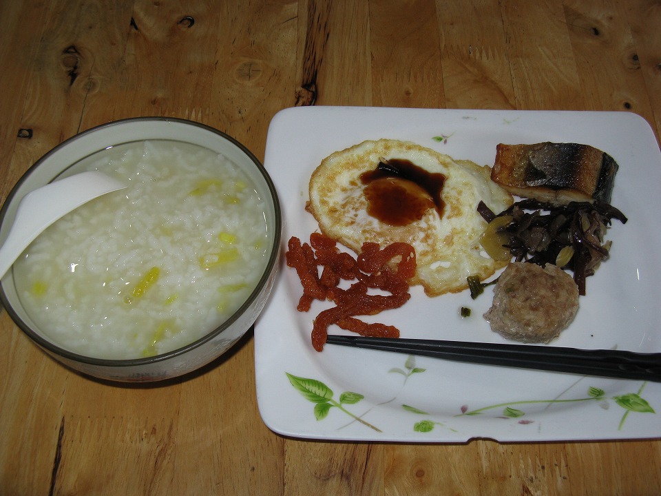 | しゃーねーから、いったんホテルに戻り、ホテルの1階にあるメシ屋 (ホテルと同じ人が経営しているみたいだが、よく見かけるただのメシ屋。)でお粥など。 残念ながらあんまし旨くなかった。これで55圓。 |