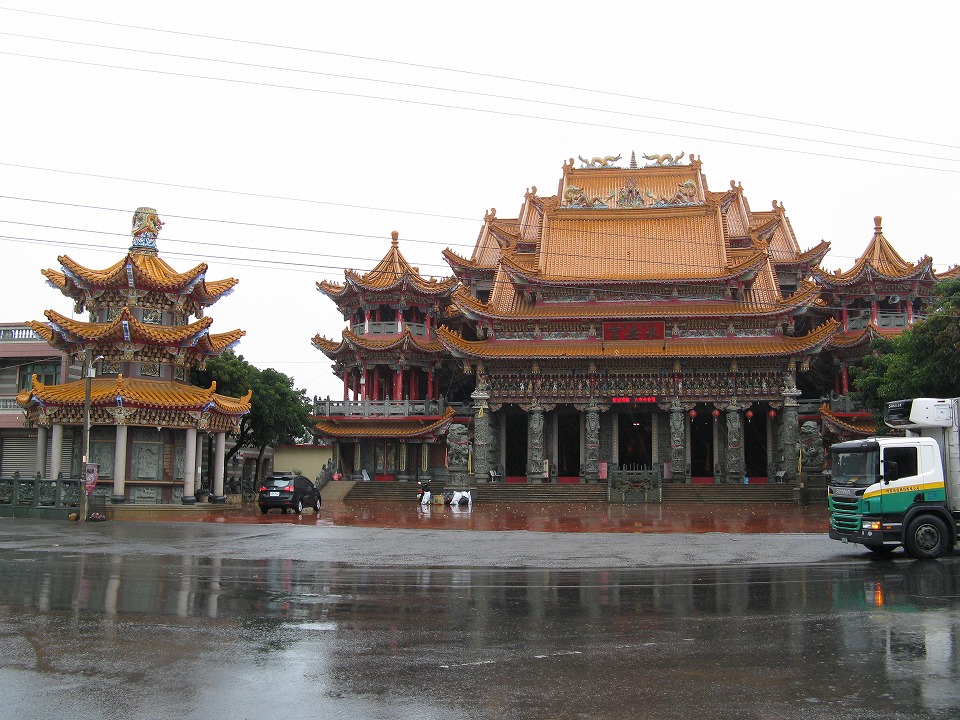 | 虎尾から約50分で大有に着いた。 相変わらず雨が降っているので、サトウキビ列車の踏切まで行くのはヤメた。 おとといと同じような悲惨さになりそうだからね。 幸いそれほど待たずに虎尾方面のバスが連続してくるようなので、すぐ帰る。 大有はあまり大きくない町のようだが、立派な寺があった。 台湾の寺は、日本の感覚からするととにかくハデだ。 |