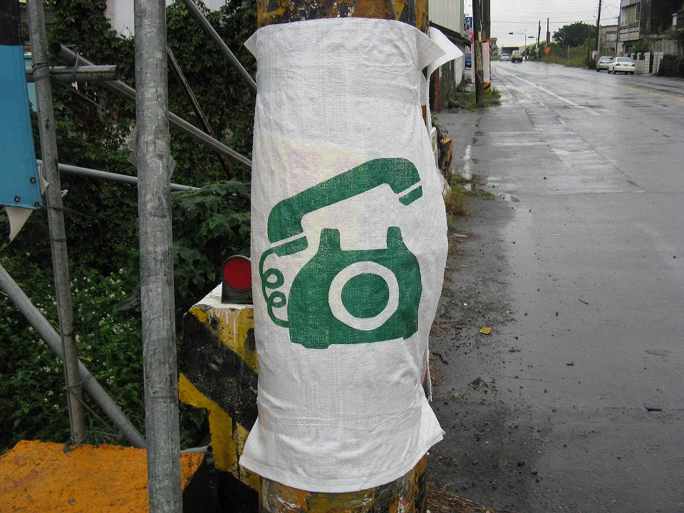 | 「松本超市」のバス停の隣の電信柱に巻かれていた。 でっかい電話マークがなんかおもしろくて…。 |
