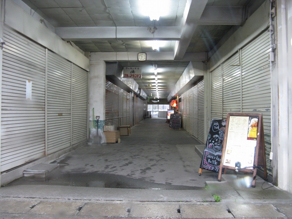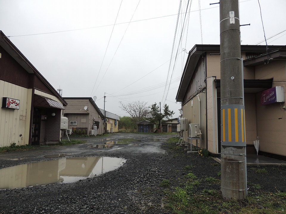 | 下北半島の大都市であるむつ市に出た。 かなりの都会で、基本的に何でも揃うが、このような場末の一角もあった。 信号待ちの間に見つけて慌てて撮ったので、写真としてはボロボロです。 時計の時刻はデタラメ。 |