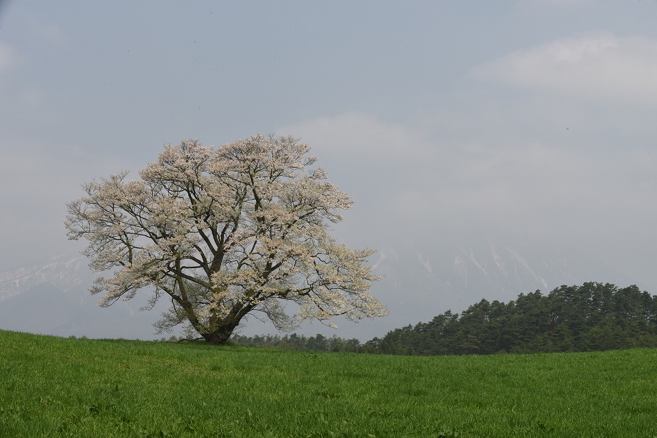 | メシを終えて、「一本桜」にまた戻ってきた。 しっかり朝になり、この写真は10時過ぎの状況。 天気は、思ったより悪くならなかったのはいいが、空は白く、後ろの岩手山も霞んでいる。 去年と今日とを足せばベストだったね。 でも、満開の「一本桜」を観ることができただけでもよかったと思う。 大型の観光バスに乗った団体の観光客も続々と訪れ、相当賑わってきた。 |