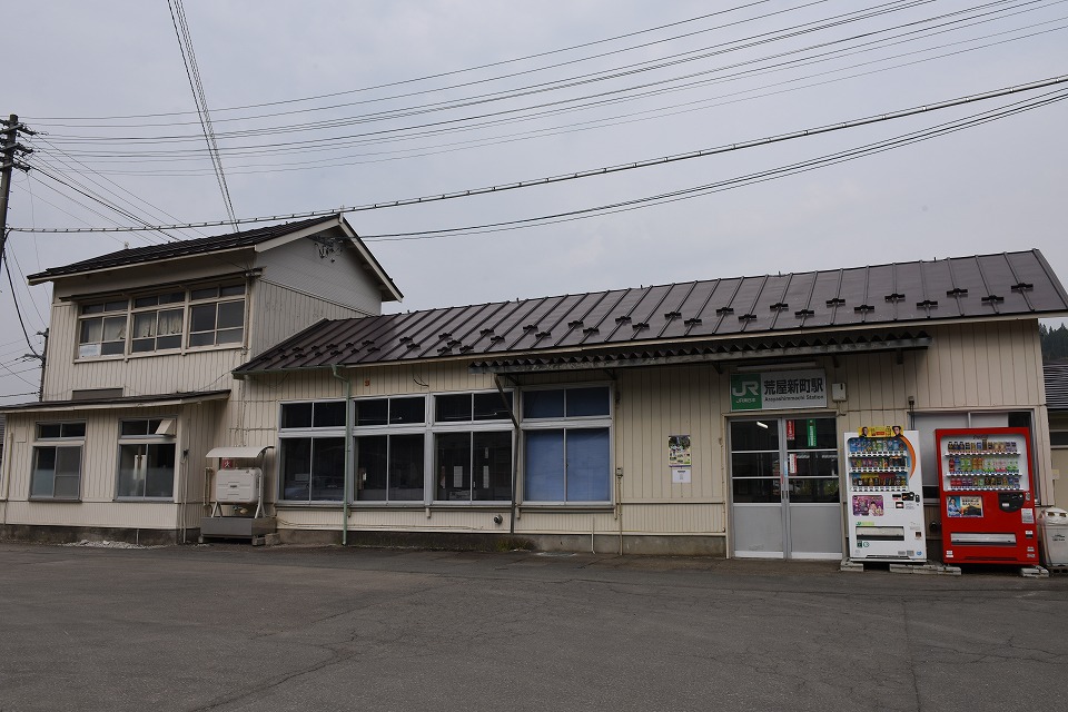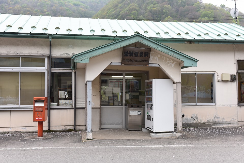 | これも味のある雰囲気の湯瀬温泉駅。 近くに湯瀬温泉の旅館街があるが閑散としていた…。 平日とはいえ、GW期間中なんだけどねぇ。 |