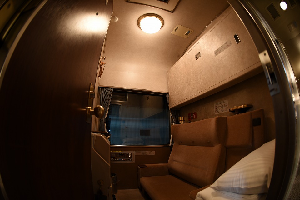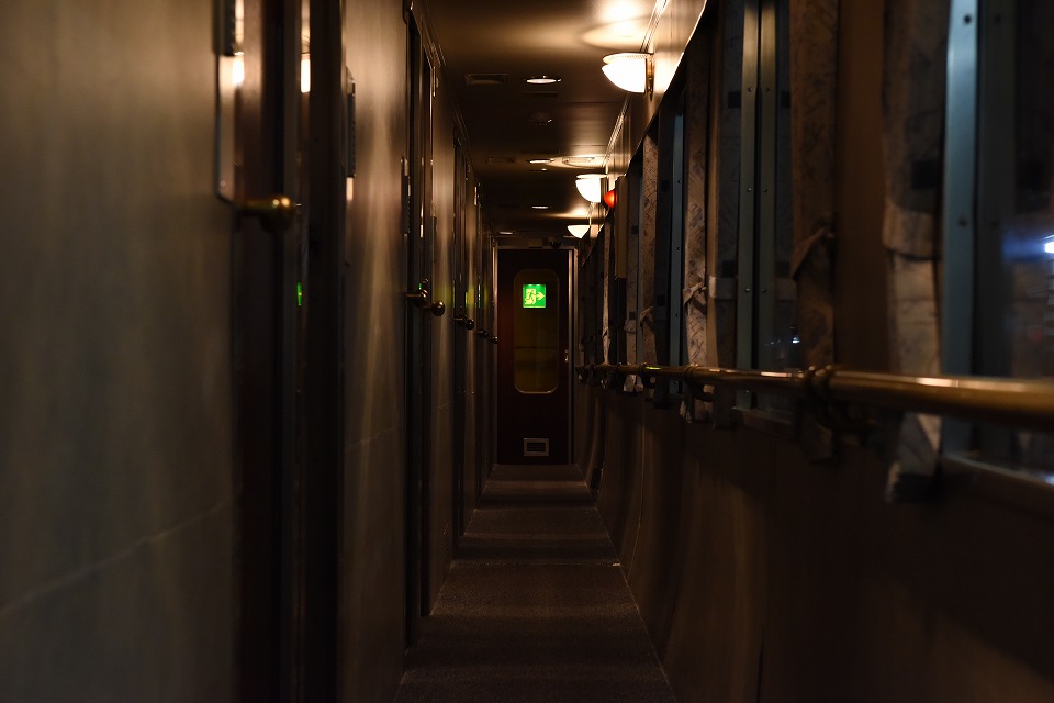 | A寝台の車両の、廊下の様子。 暖色の照明が落ち着いた雰囲気を醸し出している。 |