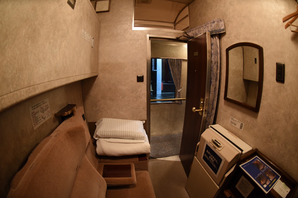 | さて、クルマでの呑み助も終わって、雨が小降りになった時を見計らって、今日の「寝床」に来た。 A寝台個室の3号室。前々回と同じだ。 B寝台個室に比べると、遙かに居住空間を確保しているね。 1泊5,940円ナリ。 |