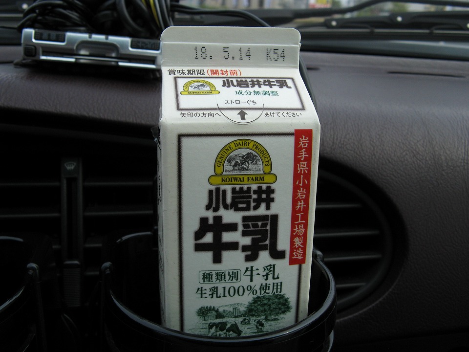 | いったん撤収し、国道沿いのスタンドで給油して、コンビニで朝メシにした。 牛乳は、明治の「おいしい牛乳」もあったが、地元工場製の小岩井牛乳を当然選ぶ! |