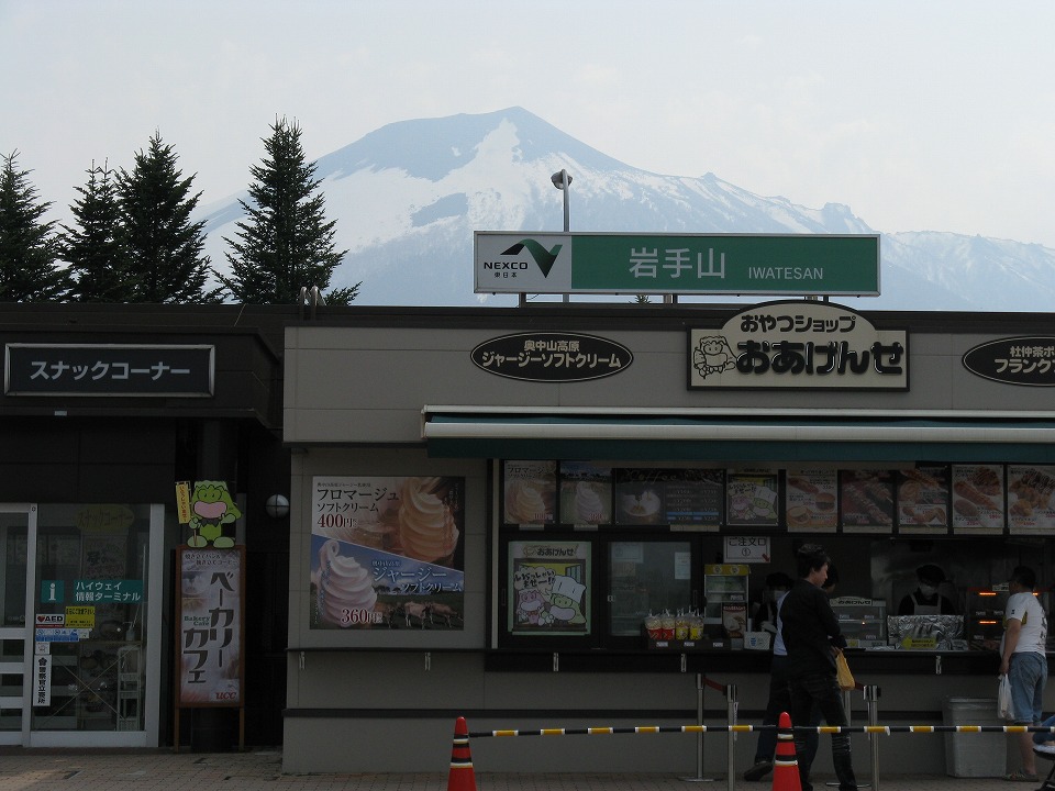 | さて、盛岡から秋田県小坂町に向かう。 途中はちょっと贅沢をして高速に乗り、岩手山S.A.で小休止する。 バックの山は、岩手県民の心の山、岩手山(2038m)。 |