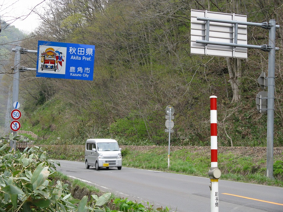 | 秋田県に入るよ。 右側の裏返ってるのは「岩手県」の表示板。 |