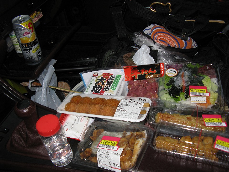 | 鹿角からちょっと走って、今日の目的地の小坂町に着いた。 「ブルートレインあけぼの」に早速チェックインして、近くのスーパーに買い出しに出かけた。 過去2回は、晩メシ(というか呑み)は「ブルートレインあけぼの」の開放ハネ(説明省略)や事務所でしていたが、 今回は、駐車場に停めたクルマの中ですることにした。 これなら、子供連れなどを気にしないで呑めるし、ラジオや音楽を好きに聴けるし、 何より、大っぴらに「店を広げられる」のがよい。 でもさ、これならいつもの車中泊と同じじゃん(笑)。 |