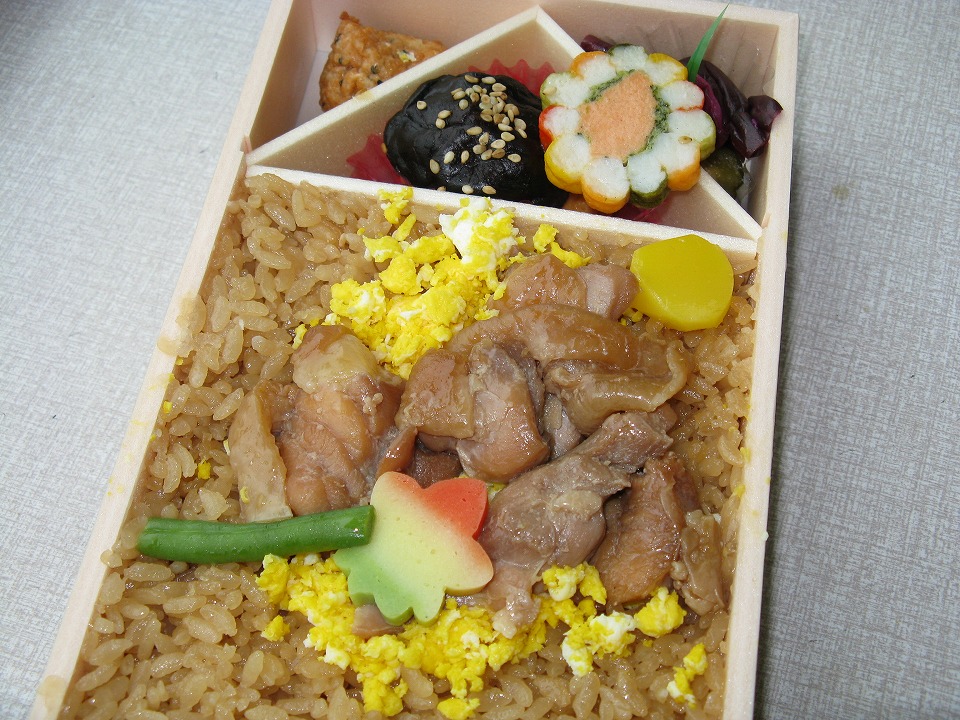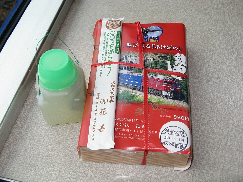 | お馴染みの鷄めし弁当。 隣の大館市から、花善さんがわざわざ届けてくれる。 掛け紙は「ブルートレインあけぼの」専用のもの。 大館駅などで売っている掛け紙とは違うんだゾ。 |