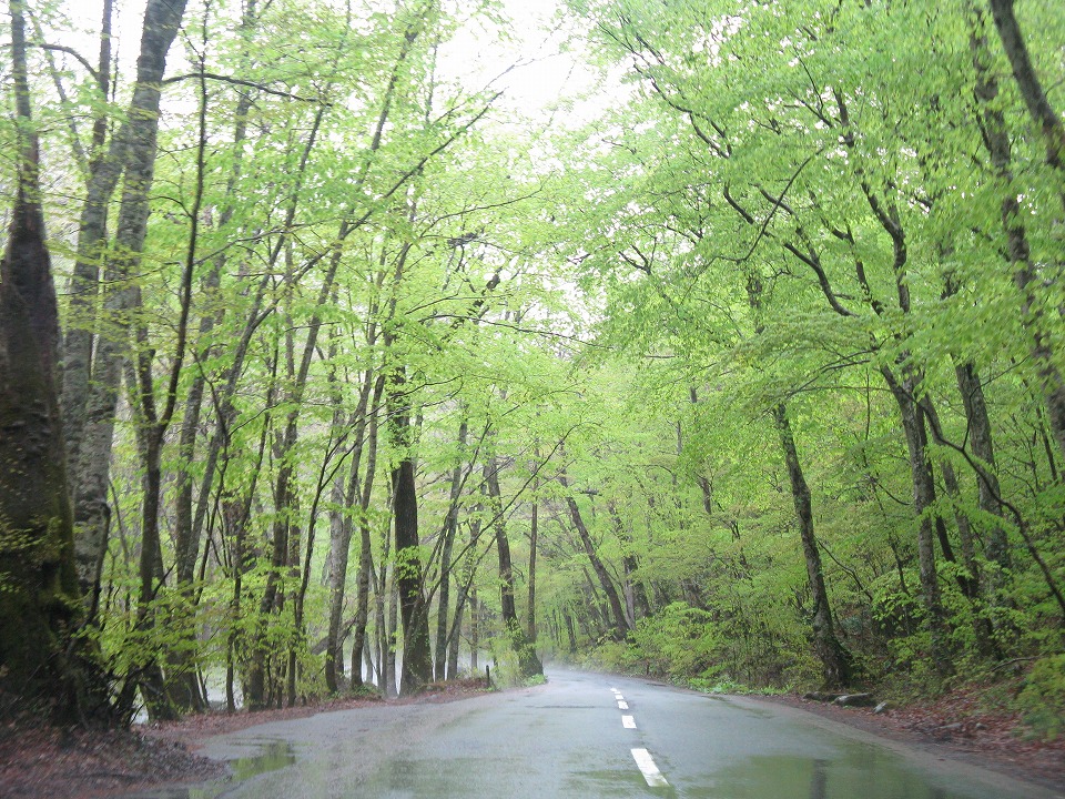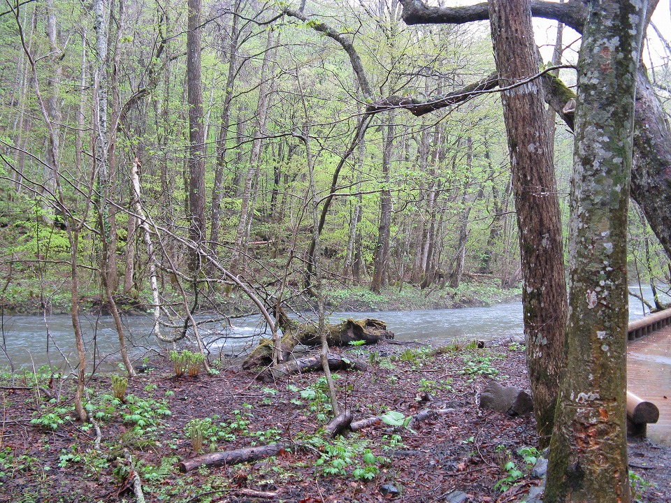 | 時々雨が降るような空模様でも、芽吹きたての青葉が目に眩しい。 曇天でこうだから、陽が射したらもっといいんだろうね。 |