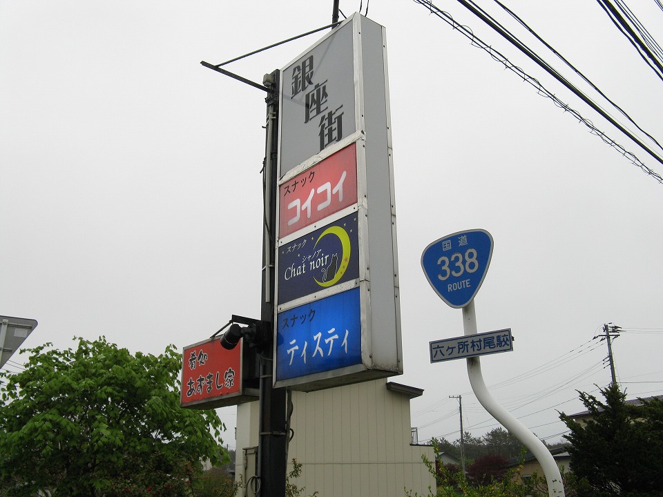 | 原子力関係で有名な六ヶ所村で見つけたステキな看板。 「銀座街」ですゼ。 ちなみに、国道338号の標識の下の「尾駮」は「おぶち」。 |