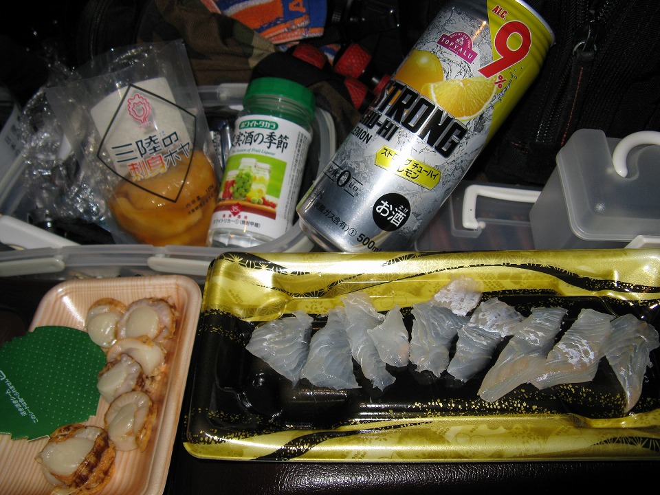 | むつ市内のスーパーで肴をGETして、マグロで有名な大間に向かう途中の、 トイレのある駐車場が今日のねぐら。 地元のホタテ刺し、ヒラメ刺しや、宮城のホヤ刺しで呑んで、 仕上げは、2つ買っておいた大館の「鶏めし」。 このページをUPしたら寝ます〜。 |
