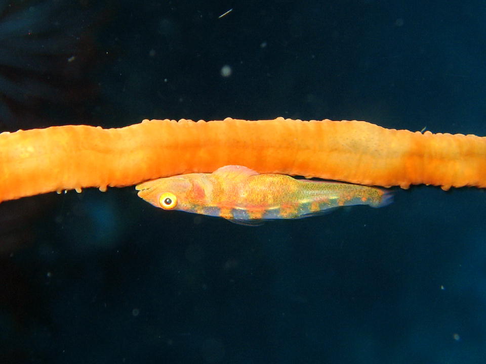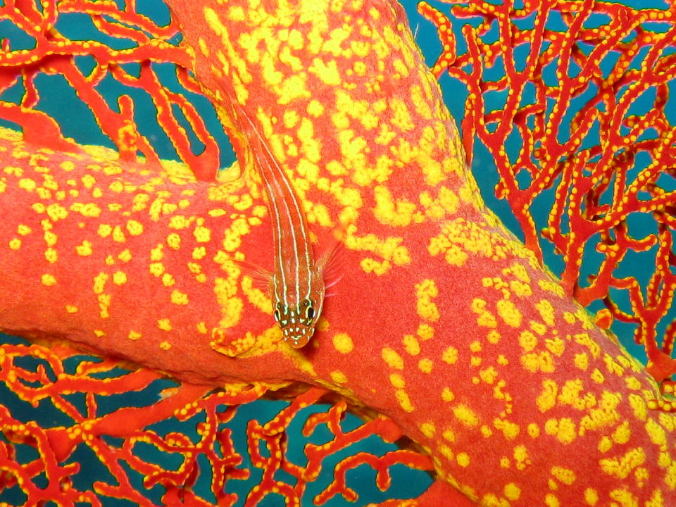 | イソバナにくっついていたタテジマヘビギンポ。 |