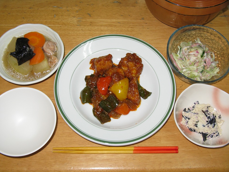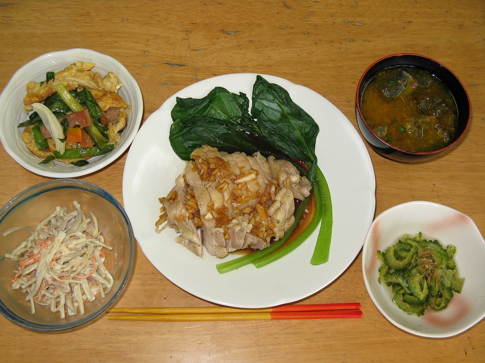 | 晩メシ。 鶏の唐揚げの予定だったが、蒸し煮に変更になった。 オリオンビールのツマミに実にいいんだね。 |