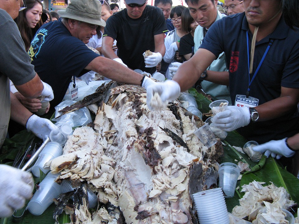 | 晩メシが終わったら、カジキ釣り大会のイベントに出かける。 さっきまで焼いていた、恒例のカジキの丸焼きを振る舞ってくれた。 今年は紙皿じゃなく、プラカップだ(笑)。 焼き上がったカジキのご遺体を「人葬」するために、フォークリフトで運ぶ約15秒の動画はこちら。 |