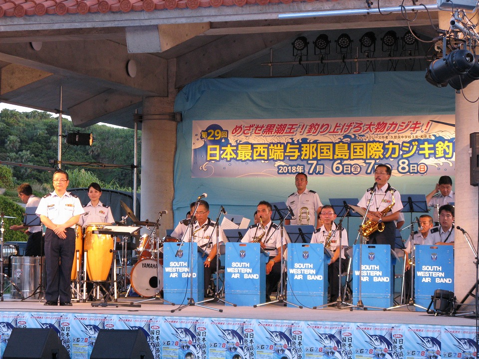 | 航空自衛隊南西航空音楽隊による、ジャズの演奏。 この後、この舞台ではいろんな「芸能」が披露され、会場は盛り上がりを見せる。 |