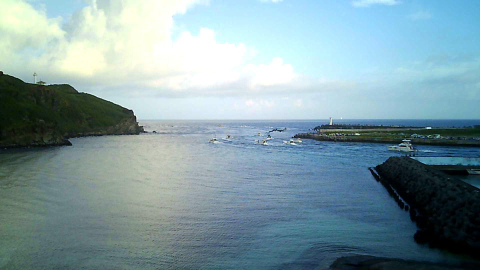 | 国際カジキ釣り大会2日目の朝7時。 「フェリーよなくに」の汽笛と共に、船が一斉に久部良港を出て行った。 この写真は、ドローンで撮影した動画からのキャプチャー。 |