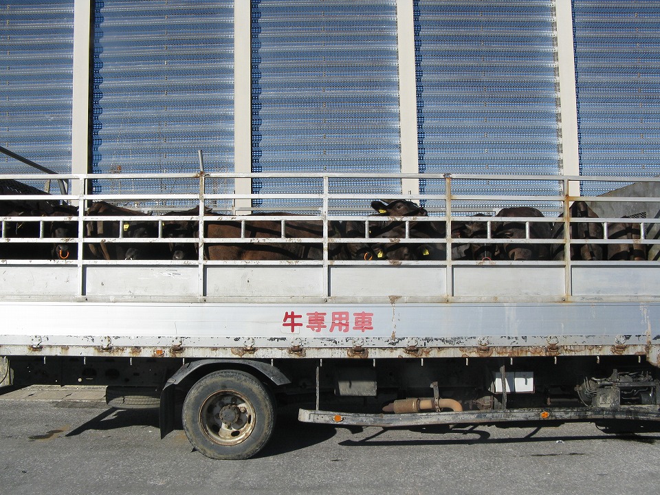 | 「フェリーよなくに」に積み込まれる牛さん。 ドナドナみたい。 |
