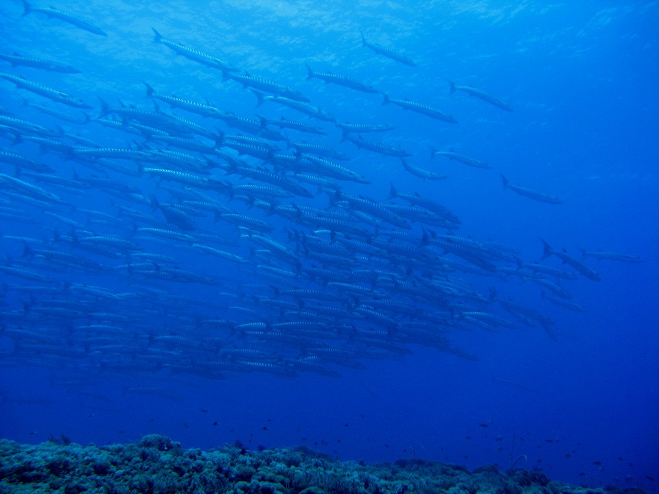 | オオカマスの群れに出会った。 中に1匹だけガーラ(ロウニンアジ=GT)がいるけど、分かるかな。 |