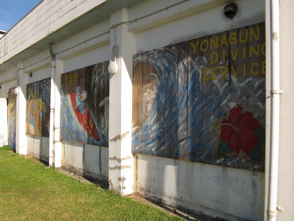 | ダイビングから帰って来たら、食堂の窓に台風対策の雨戸がはめられていた。 雨戸の外側に絵が描かれている。 |