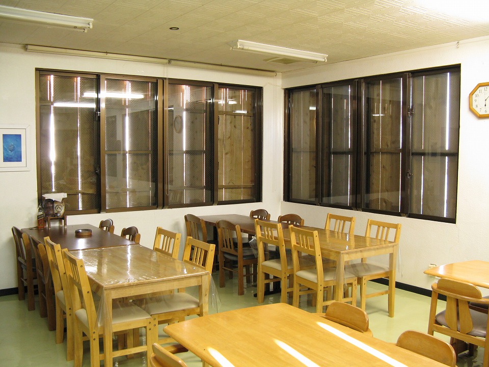 | 食堂の中から見るとこんな感じ。 暗い〜。 |