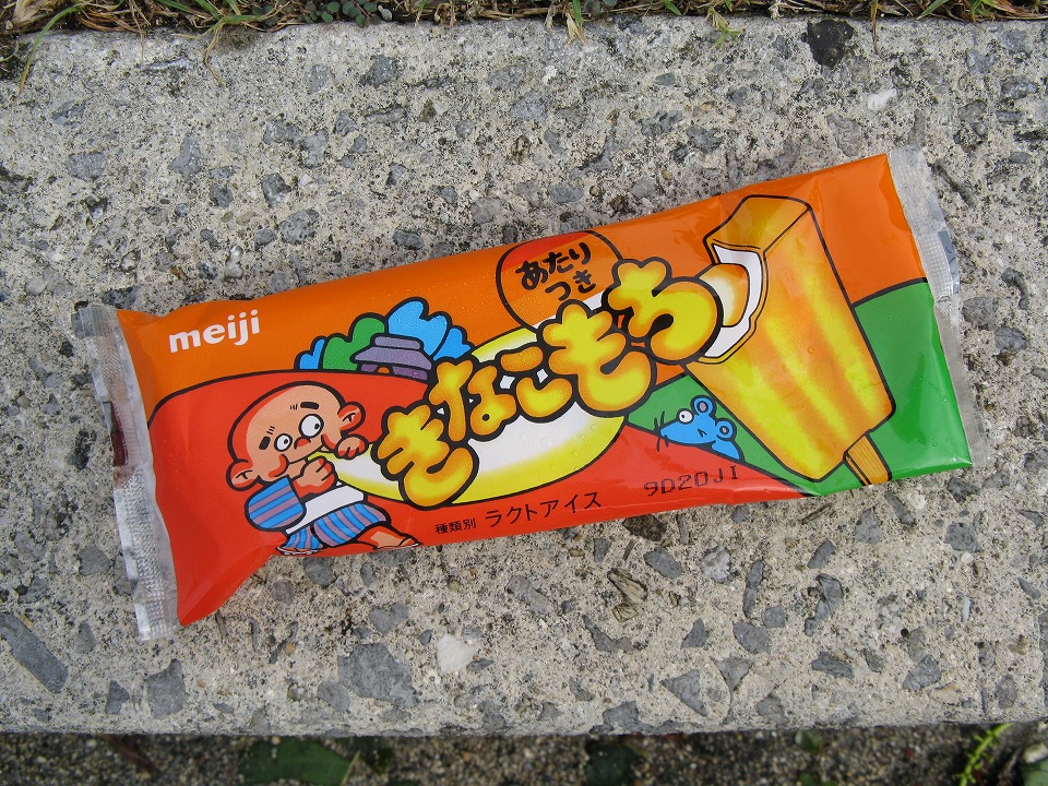 | 郵便局の近くのまちぐゎに、なんときなこもちアイスがあった! 迷わずGET! 90円。 |
