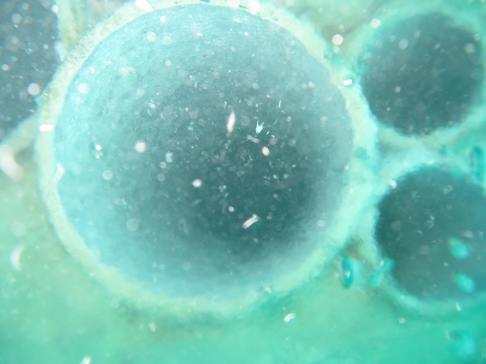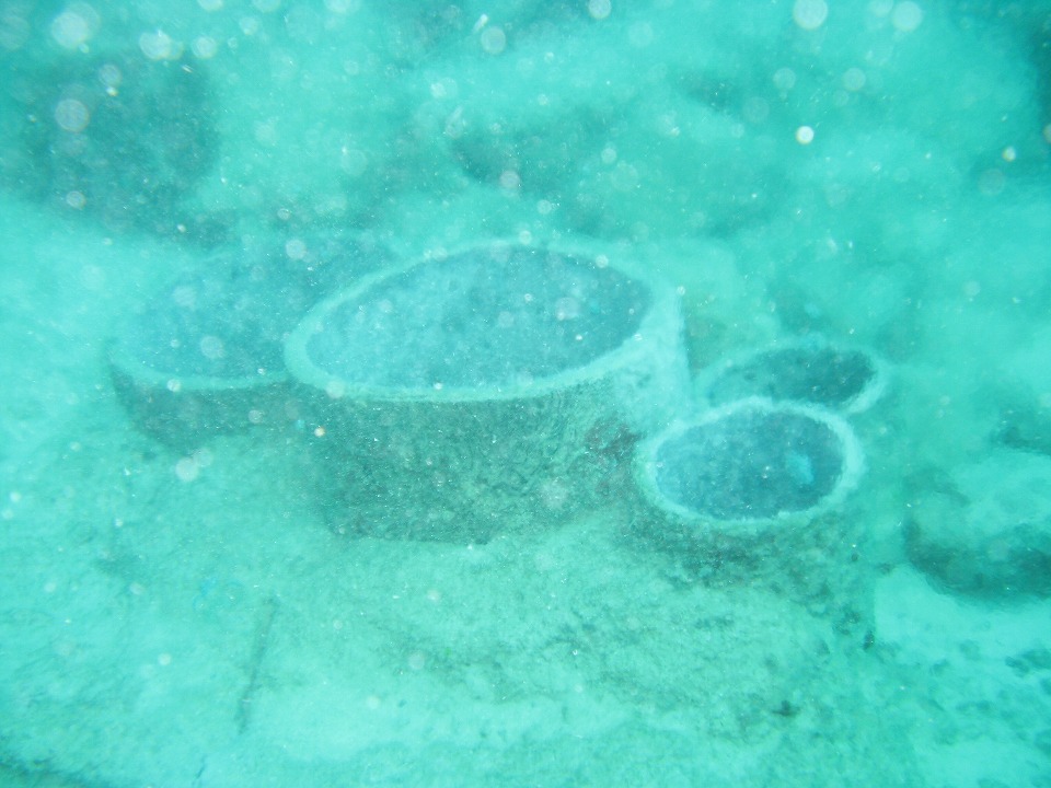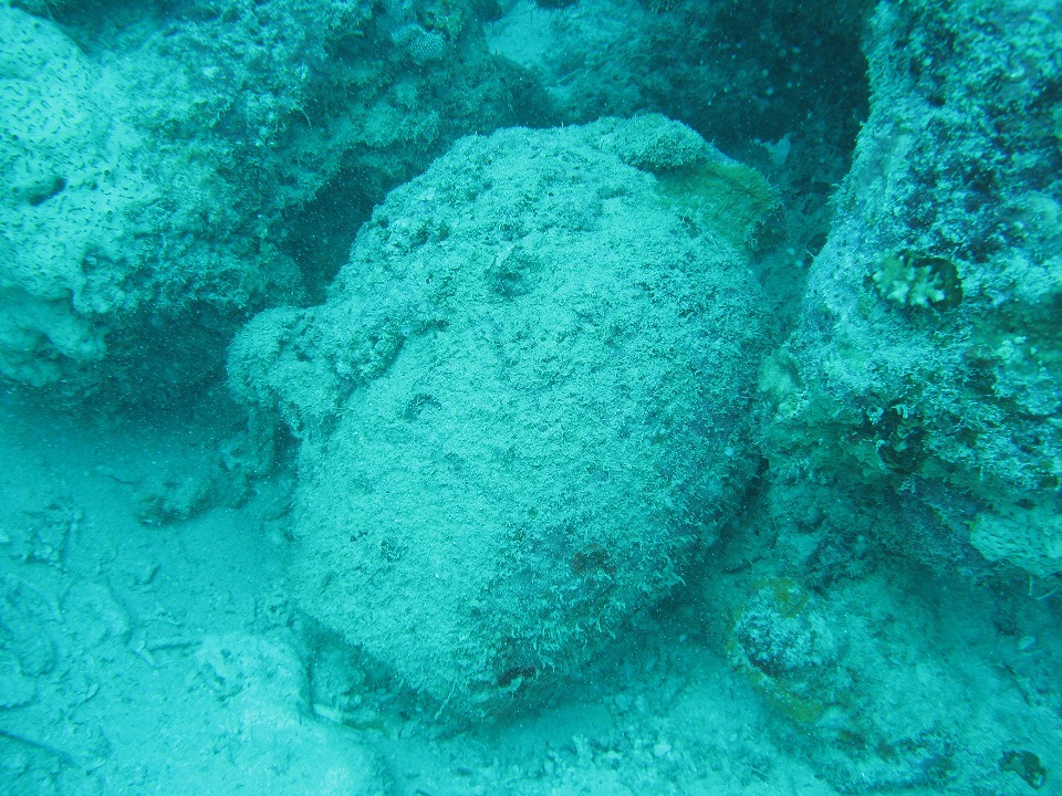| 1本目は「屋良部(やらぶ)海底遺跡」のポイント。 250年程前に沈没した船の積荷が確認できる。 この写真は、壺。 |
