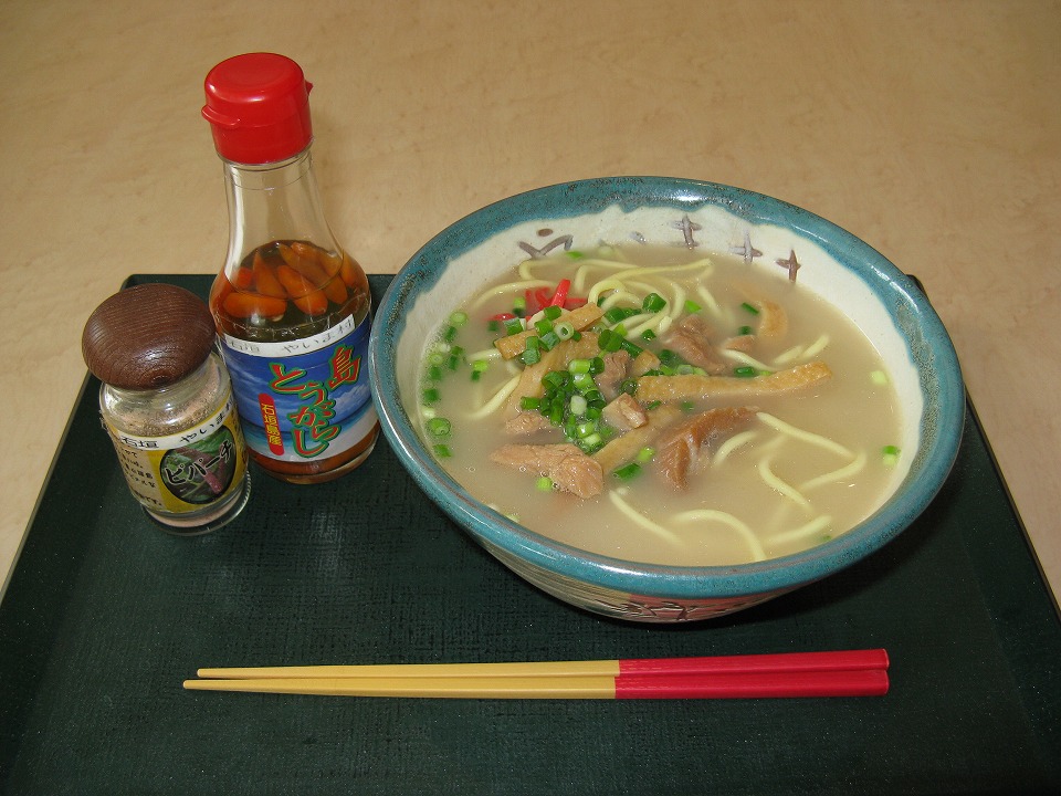 | さあ、ナツのやいまの最終日。 朝イチに郵便局でゆうパックで生活物資などを発送してから、 空港バスで石垣空港に出た。 普段は、空港では値段が高いからメシを喰わないが、 石垣空港に入っている「やいま村」はそれほど高くなかったので、 内地へ行って来ます、の一杯をすする。 これが意外と(失礼)旨かったんだね。 八重山そば600円ナリ。 |