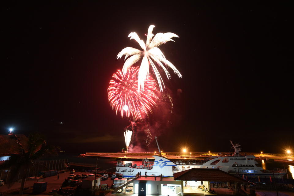 | カジキ釣り大会の〆は花火。 花火は2年前にも撮影したが、勝手が分からず大した写真が撮れなかったので、 今回はアングルなどを精査して撮影に臨んだ。 それでも、約150枚撮影したうちで、まーまーかなと思えるのはせいぜい5〜6枚だけだった。 今年の花火はなかなか豪華で、十分楽しめたよ。 その年によってカネの集まり具合で花火の打ち上げ数もきっと変わるんだろうね(笑)。 |