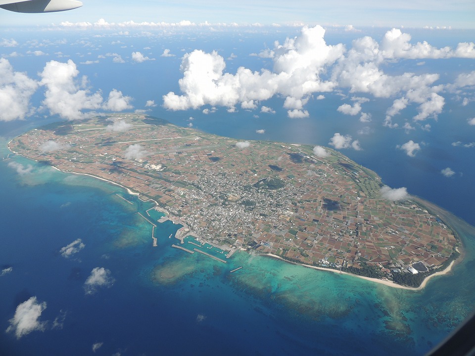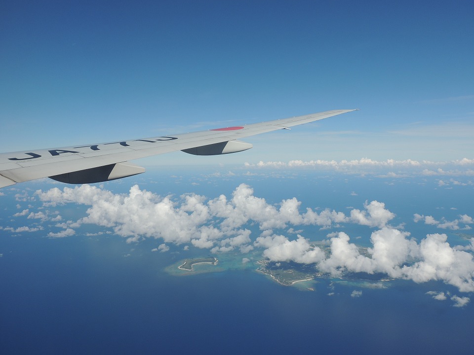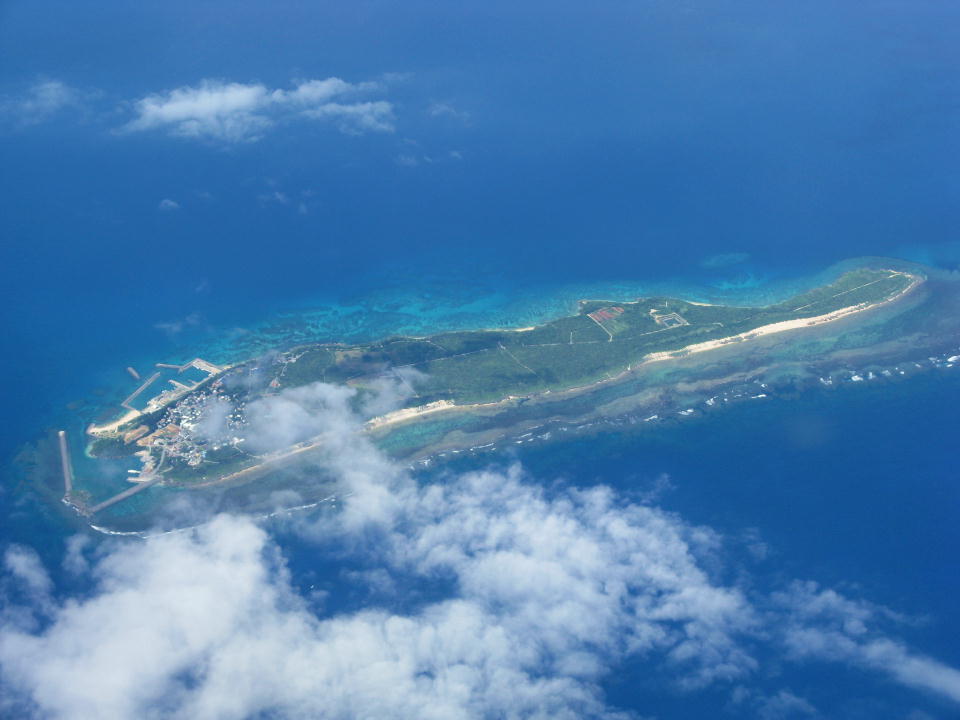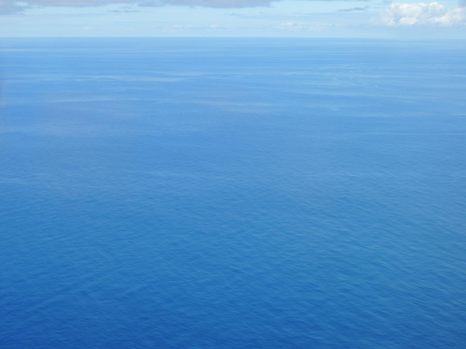 | 那覇から約1時間で南北大東島のエリアに達する。 この写真は北大東に着陸するちょっと前。 素晴らしい凪の状態。 |