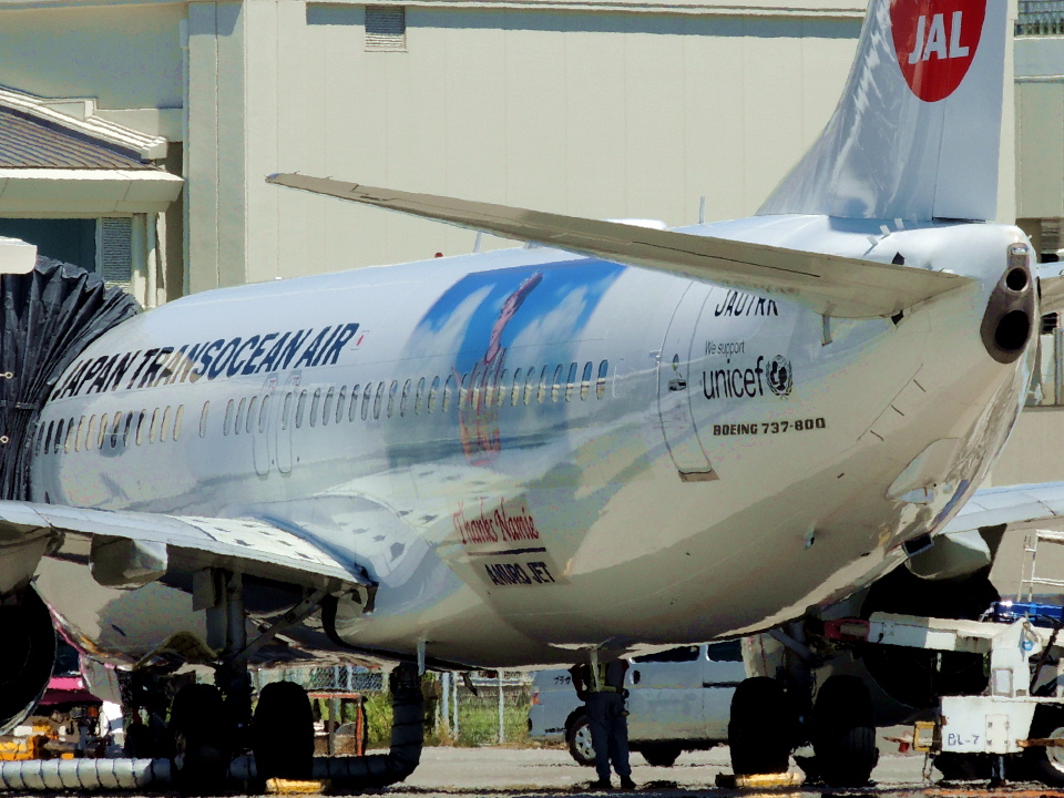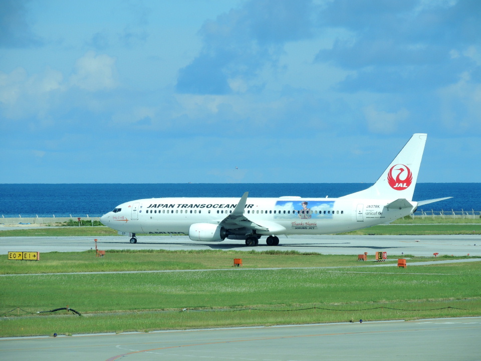 | 那覇空港に着いたら、ちょうど「アムロジェット」の運用だったJTA605便石垣行きが出発していった。 |