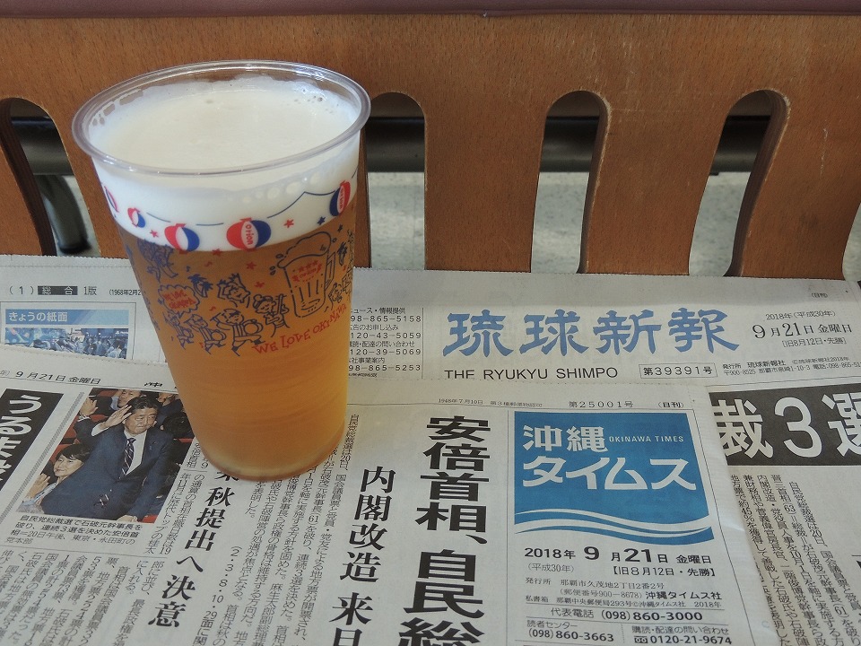 | 那覇で乗り継ぎ時間が約4時間あるんで、 オリオンの生を呑みながら、地元の2紙をゆっくり読み、 このページを作る~。 |