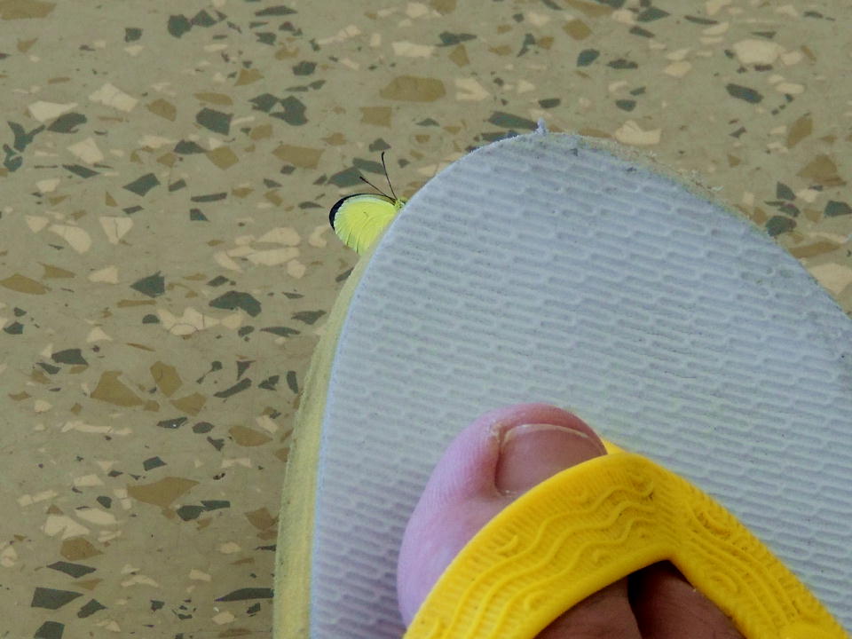 | するとなんと、モンキチョウは、俺の島ぞーりに止まったんだよね。 たまたま、つま先を上げていたから、その下に止まってしまって、 つま先を下ろせなくなっちゃった。 キンチョーしていると、そのうちまた飛んで行っちゃった。 踏みつぶさなくてよかった~。 |