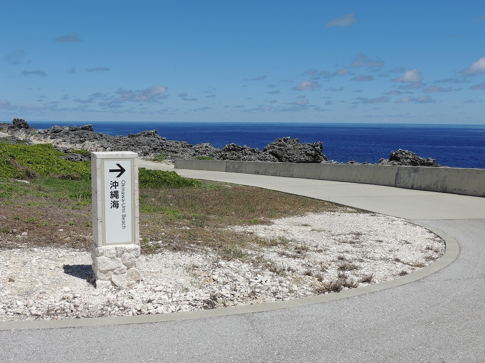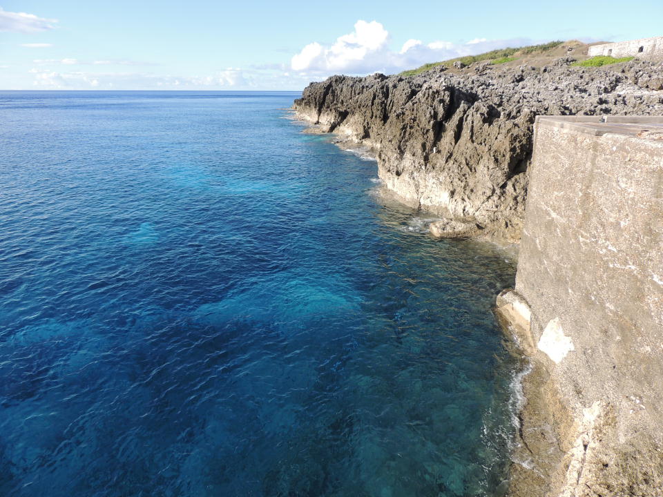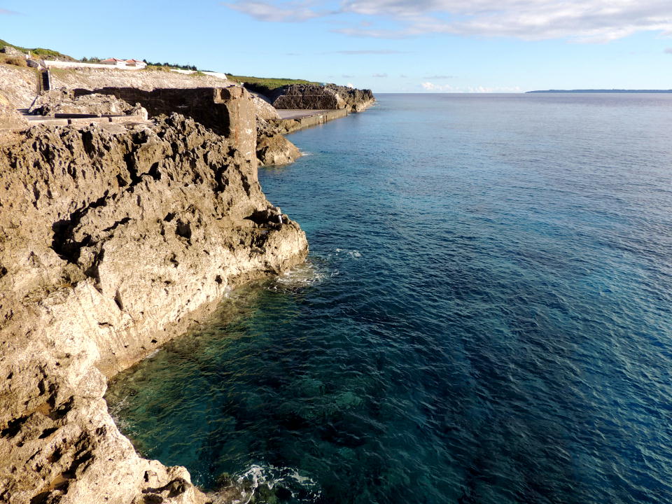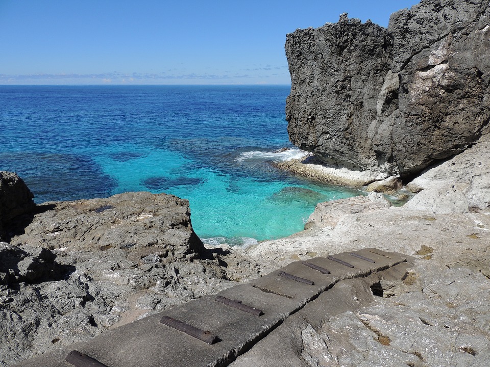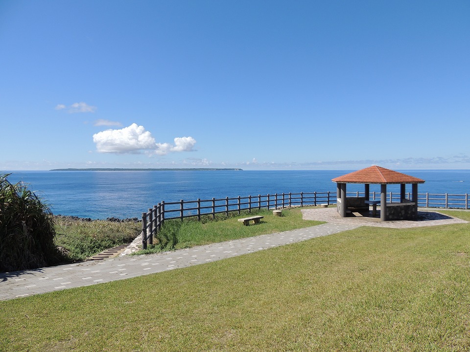 | 「上陸」の公園に来た。 東屋があり、写真左側から海に下りられるようになっている。 写っている島は南大東島。 |