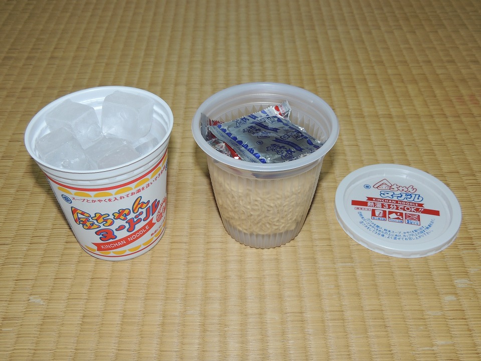 | しまー(泡盛)用に、宿の系列の浅沼商店で氷を50円で分けてもらった。 氷の大部分は共用冷蔵庫の冷凍室に隠して、とりあえず必要な分だけ部屋に置いておく。 こういうときに、金ちゃんヌードルの二重カップが役に立つんだね。 二重カップの外側を氷入れに使えるのよ。 |