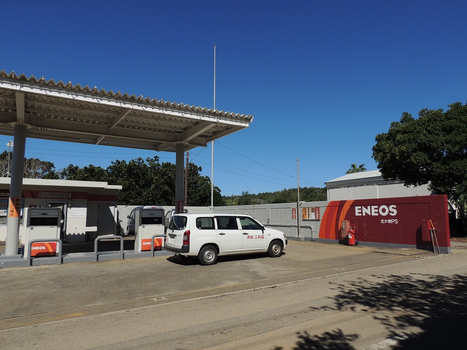 | 宿から3,000円を預かって、島で唯一のスタンドで給油。 まさか北大東島で給油するとは思わなかった。 |