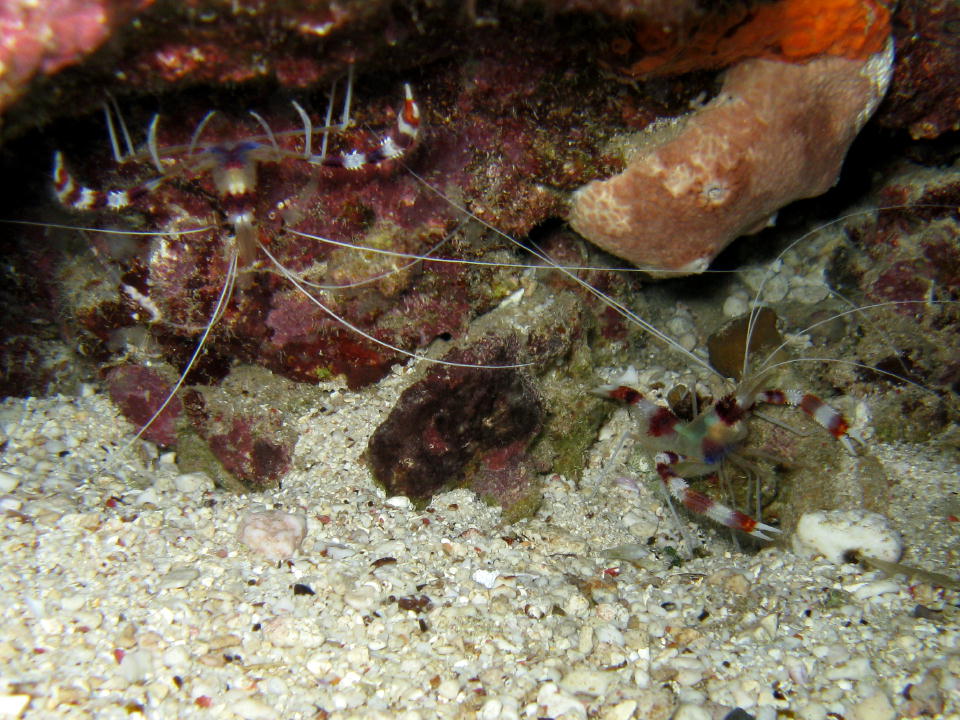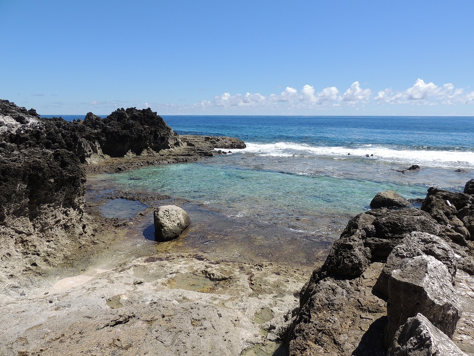 | 基本的に浅くて、大人なら大体の場所で立てる。 「スキンダイビング」はできず、ただ浮かんでシュノーケリングしかできなかった。 魚影は薄い。南大東島の海軍棒プールや塩屋海岸の方がずっとお魚が多い。 たまたまタイミングなのかな。 辛うじて、穴ボコにオトヒメエビがいた。 |