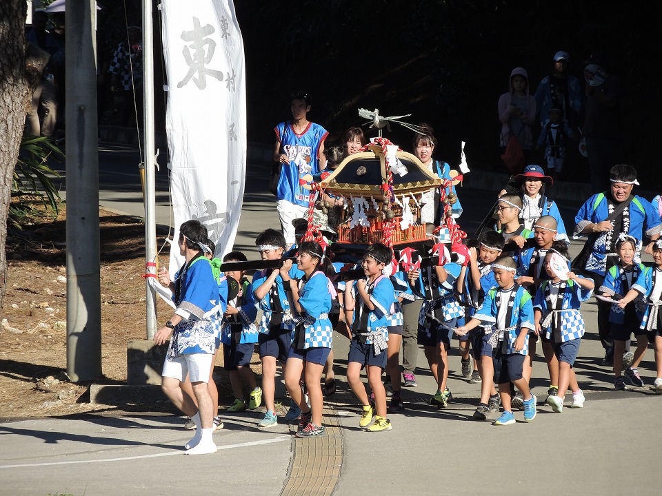 | これはちびっ子御輿だが、トラクターが牽くお囃子のトレーラーや、大人の御輿も出ている。 女子チームの御神輿がない(ように見えた)のが残念(笑)。 |