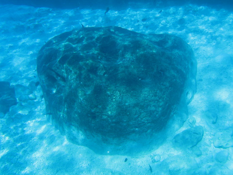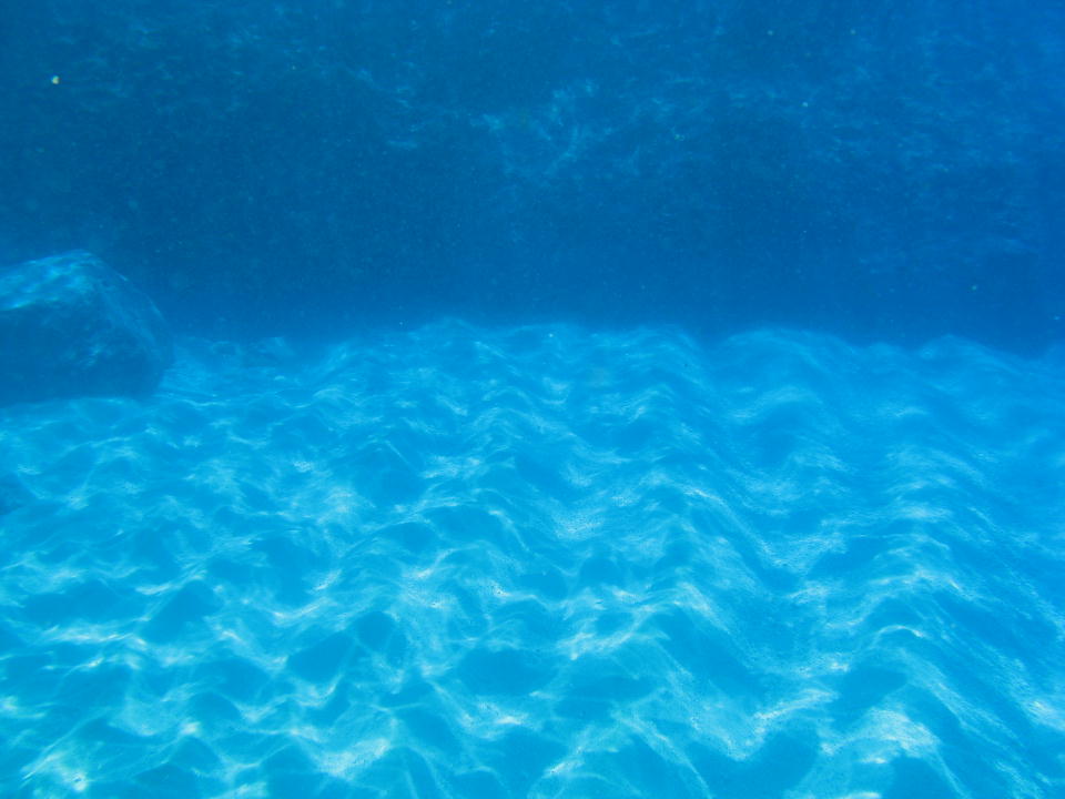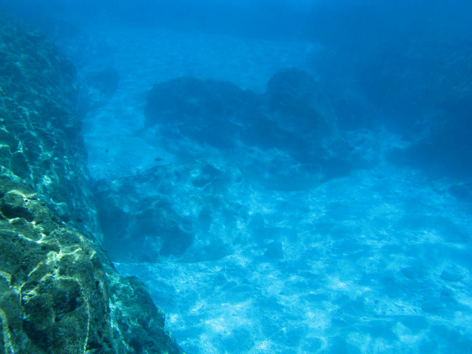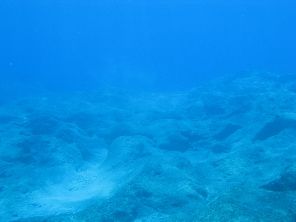 | すぐに素晴らしい透視度の世界が広がった、40~50mはあるよ。 午前中に潜った上陸より間違いなく透視度が高い。 年中強い波に洗われているからか、割となめらかな石(削れた溶岩か?未確認。)の海底が広がる。 サンゴや植物がないせいか、クリアブルーの気持ちいい世界。 お天気もいいから、海の中も明るいよ。 |