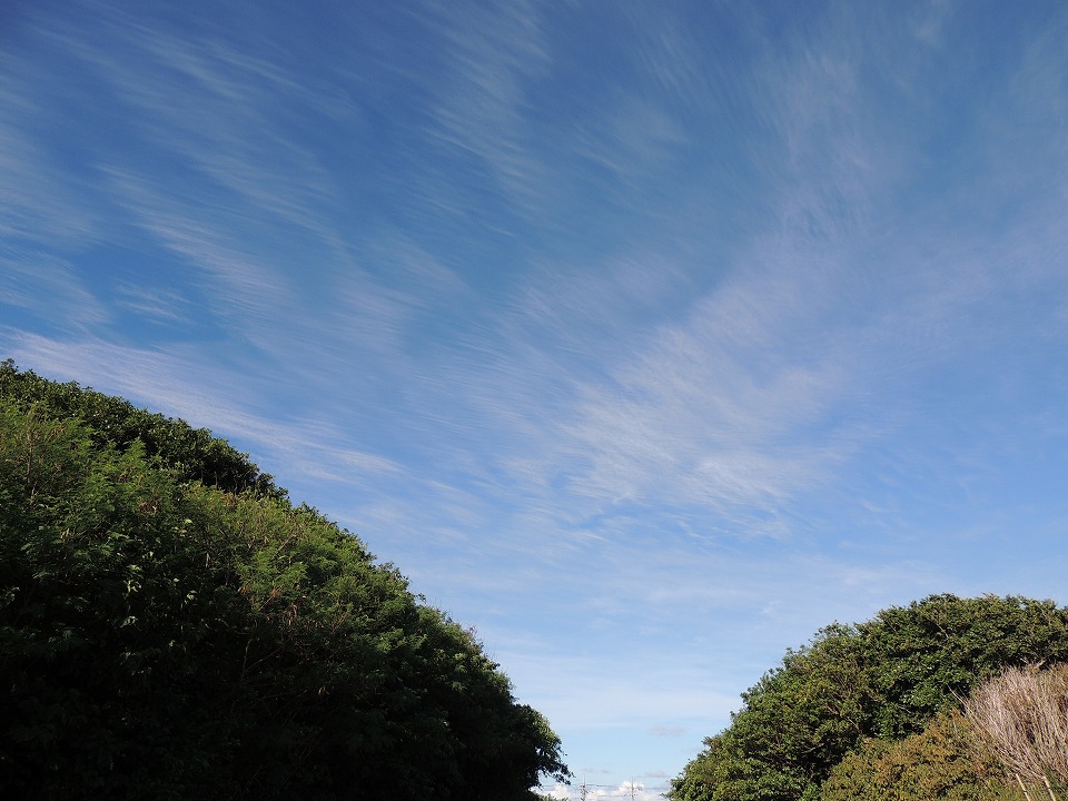 | 今日も晴れたが、雲があり、東風が少し吹いている。 なかなかおもしろい筋雲(というんだろうか)も広がっていた。 |