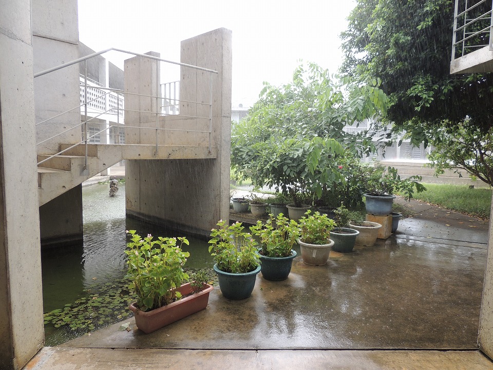 | ハラがふくれて、これで晩まで持つぞとレストランを出たら、 さっきまでの弱い雨が、強いスコールになった。 30分ほどロビーで時間を潰して、雨が止んでからまた歩いて「二六荘」に帰って来た。 |