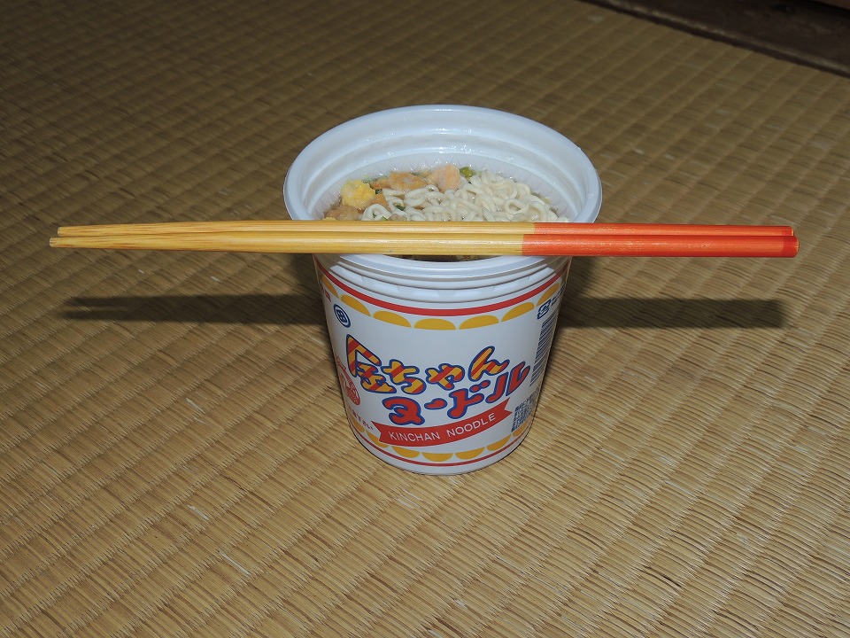 | 宿の食堂に戻って、昼メシ。 宿からは提供されないので、隣の「浅沼商店」で買ったU.F.O.にした。 体にゃ悪いんだが、旨いんだよね〜。 |