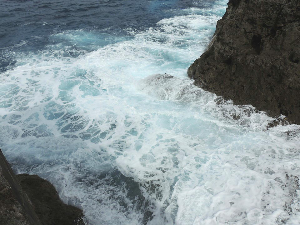 | 数日前にスキンダイビングした西港(北)に来てみたが、 波がざっぱんざっぱんだった。 北大東島の波としてはこんなのは随分静かな方だが、 ダイビングのエントリー(海に入る)地点としてはとてもムリなレベル。 波打ち際まで急な坂になっているので、波で海から打ち上げられたとしても、、 その後の引き波が、とても人間が太刀打ちできるような力ではない。 |