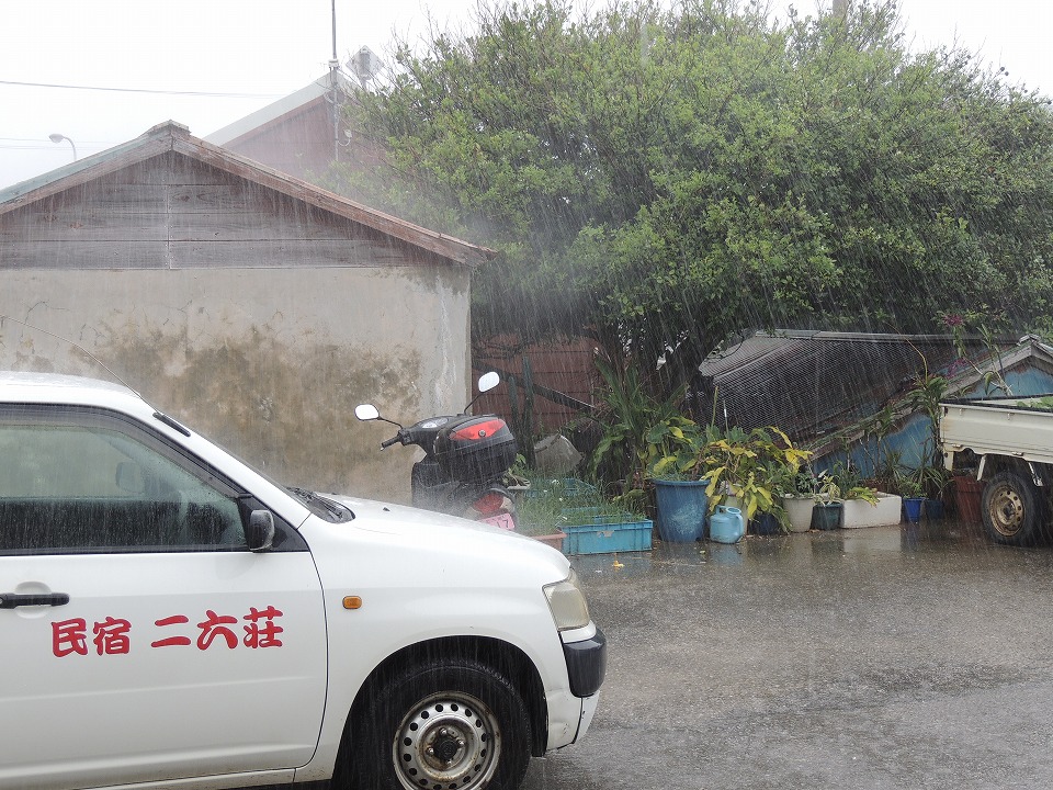 | 「二六荘」のオヤジさんに教えてもらった、北大東島のもう1軒の宿である「はまゆう荘」まで来た。 「二六荘」からてれてれ歩いて24〜5分。ここにレストランがあり、メシが食えるはずとのこと。 到着したタイミングで雨が降ってきた。 |